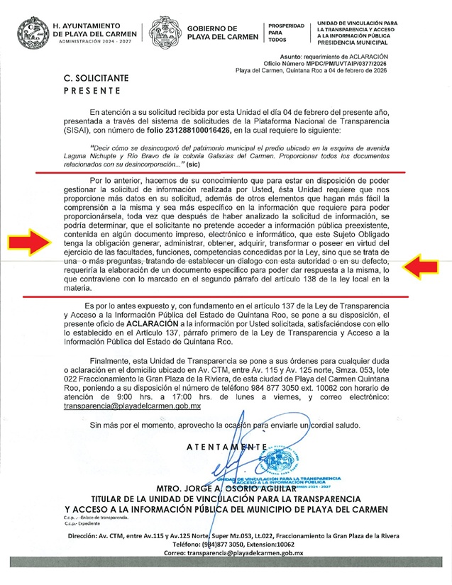 A través de una solicitud de información se requirió al ayuntamiento de Playa del Carmen, “decir cómo se desincorporó del patrimonio municipal el predio ubicado en la esquina de avenida Laguna Nichupte y Río Bravo de la colonia Galaxias del Carmen”.